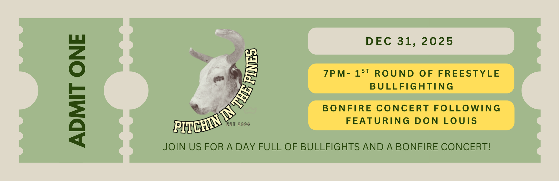 Best Value — enjoy both days of Pitchin’ in the Pines, including the New Year’s Eve bonfire & Don Louis concert, plus all the action on New Year’s Day.